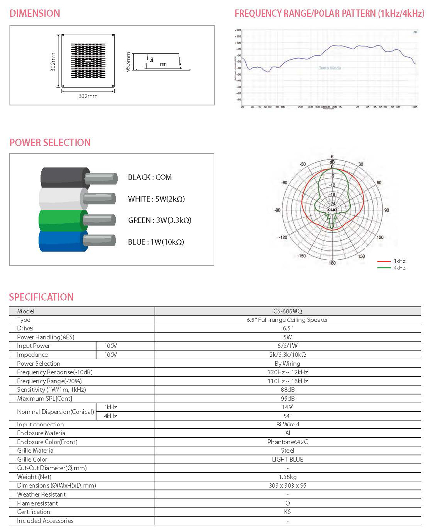 - KS 인증 스피커(CS-605MQ 인증 획득), KS 기준에 따른 개발, 생산으로 높은 신뢰도, 내구성, 난연성이 보장되는 고품질 스피커 입니다.