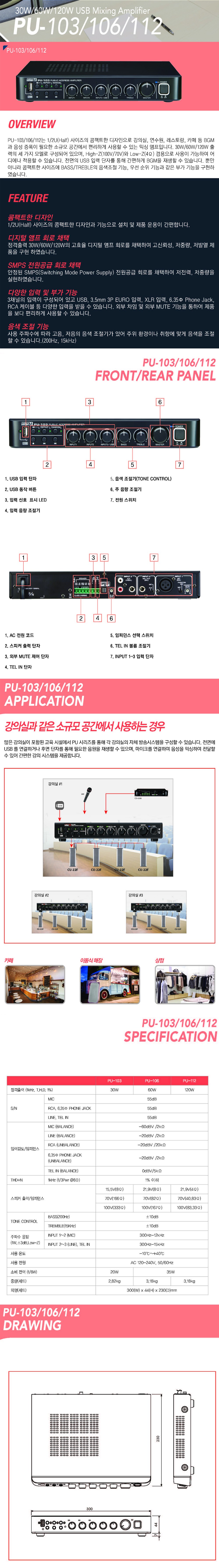 - PU-106은 High/Low 임피던스와 USB 입력, MP3를 지원하는 MIXING AMP입니다.