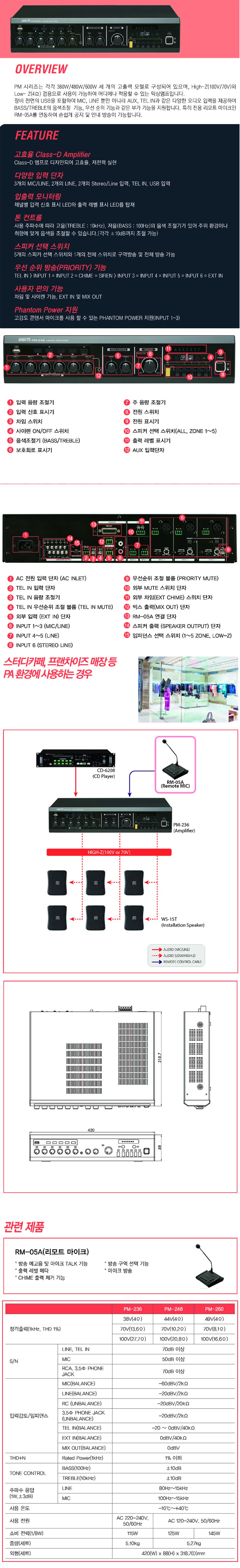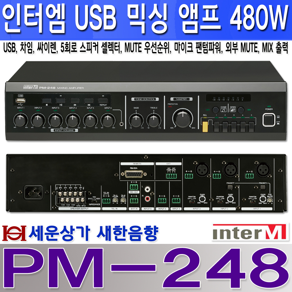 PM-248 인터엠 USB 믹싱 앰프 480W, 차임, 싸이렌,뮤트,외부뮤트,TEL IN, 팬텀파워, 5회로 셀렉터, PM248 본문