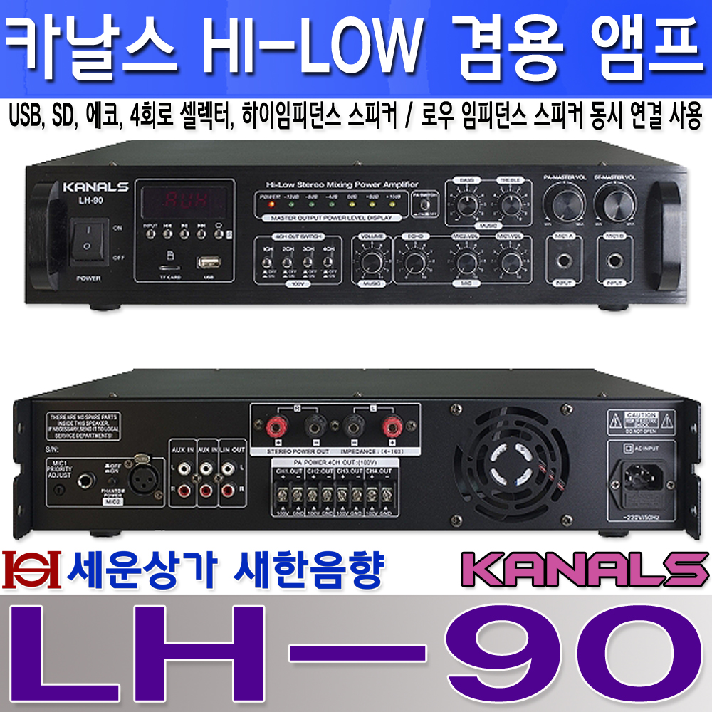 LH-90 카날스 하이임피던스 로우임피던스 동시 사용 앰프, USB, TF CARD, 에코, 4회로 스피커 셀렉터(하이임피던스) 90W, 로우임피던스 90W X 2채널