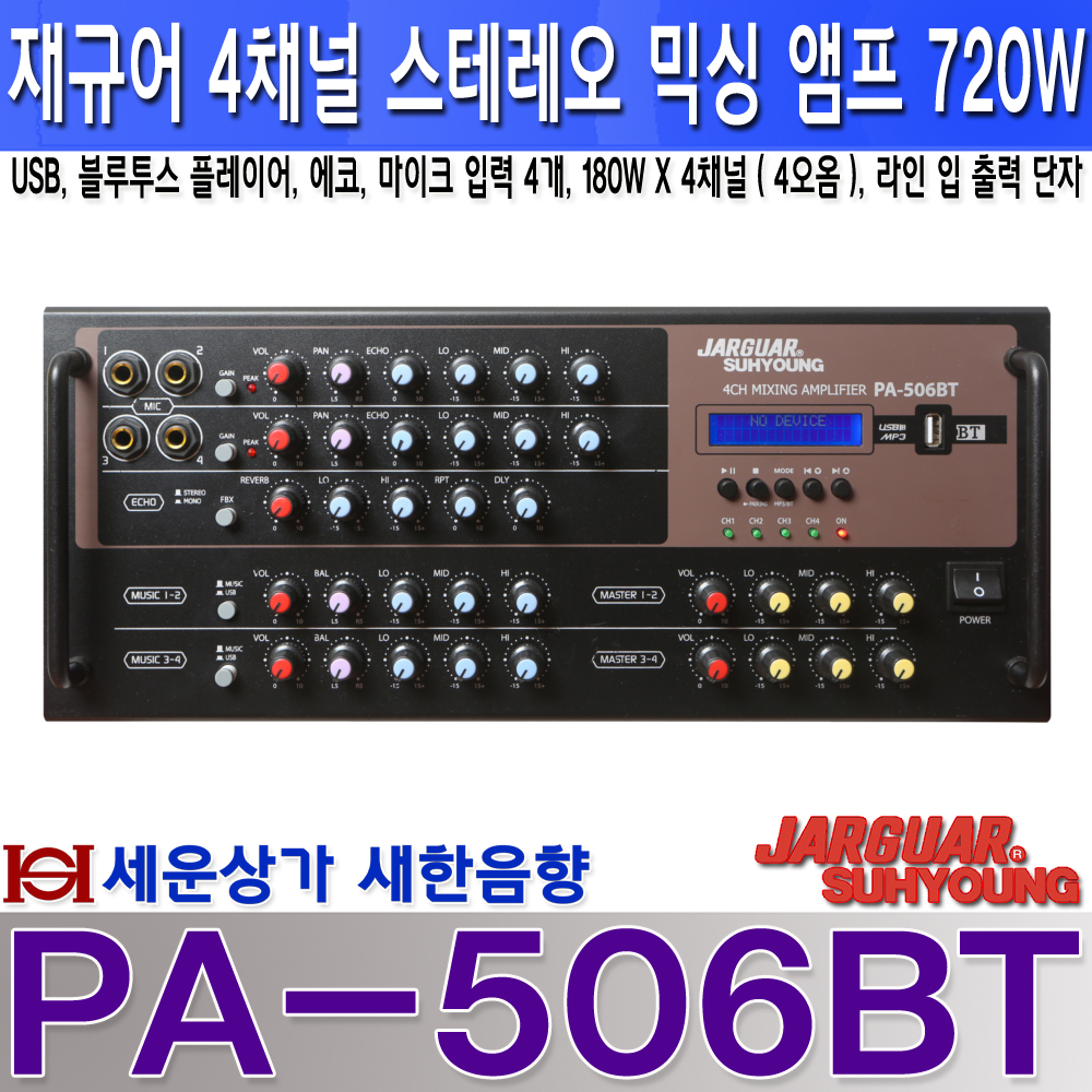 PA-506BT 재규어 4채널 앰프720W, USB, 블루투스, 에코, 마이크 입력 4개 : 새한음향 세운상가
