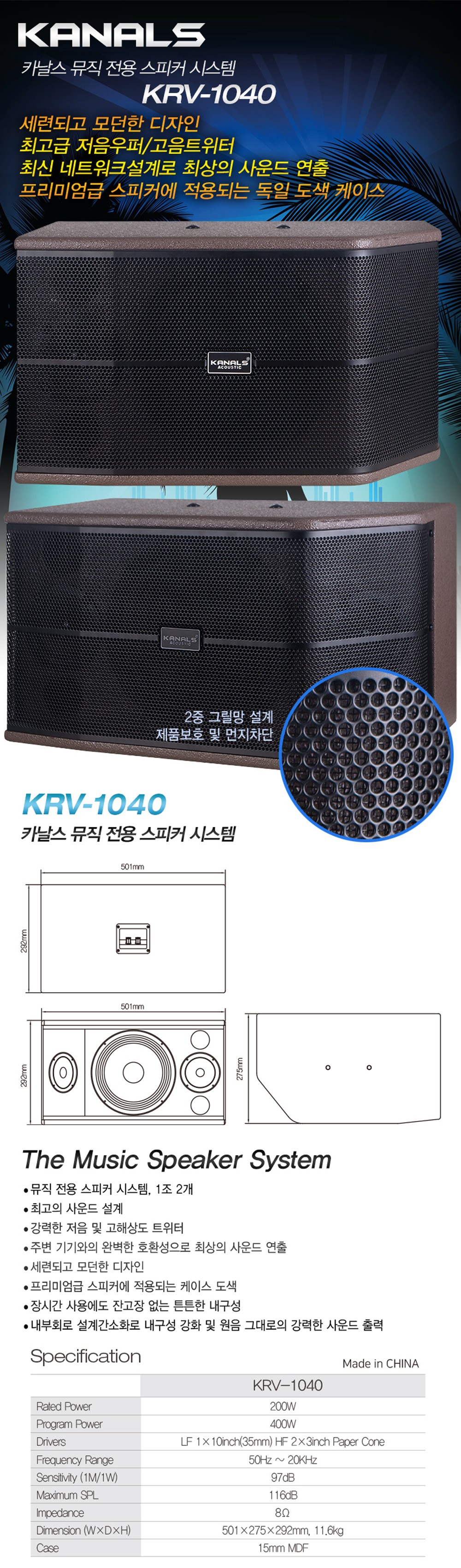 KRV-1040 카날스 10인치 프리미엄 뮤직 스피커, 최대 400W, 강당, 휘트니스, 강의실, 전시장, 회의실, 교회, 음악실, 카페, 매장 등, KRV1040 본문