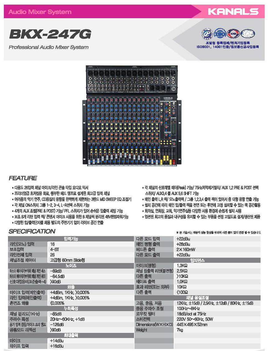 - 품 명 : 카날스 전문가용 오디오 믹서 / 콘솔 믹서 / BKX-247G