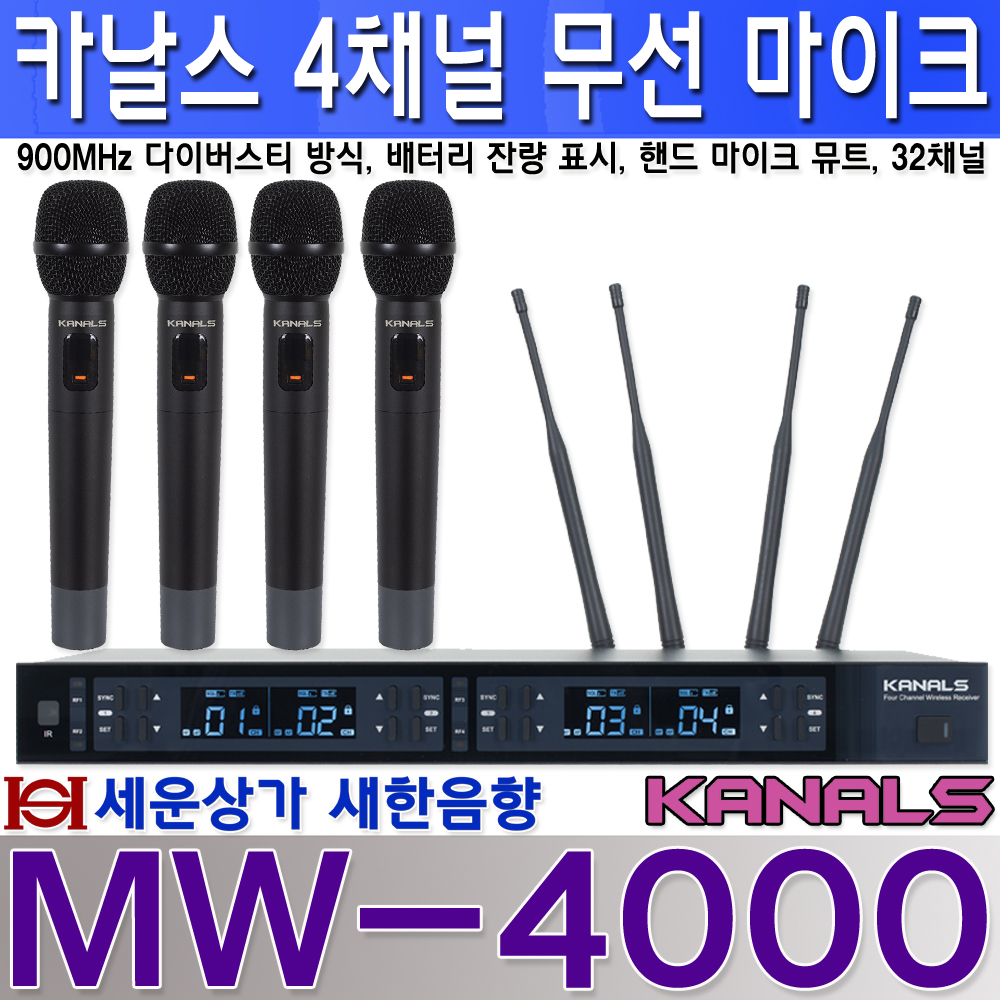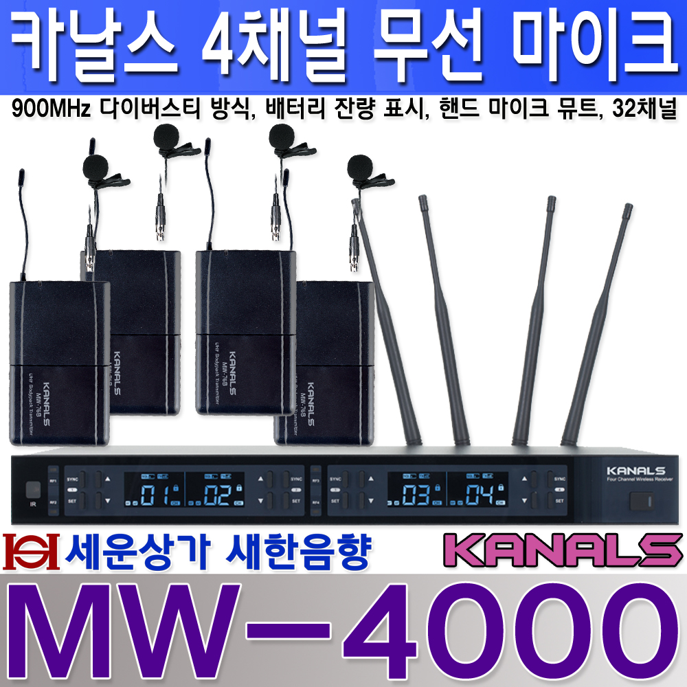 MW-4000 카날스 4채널 무선 마이크, 900MHz 가변식, 배터리 잔량 표시 : 새한음향 세운상가