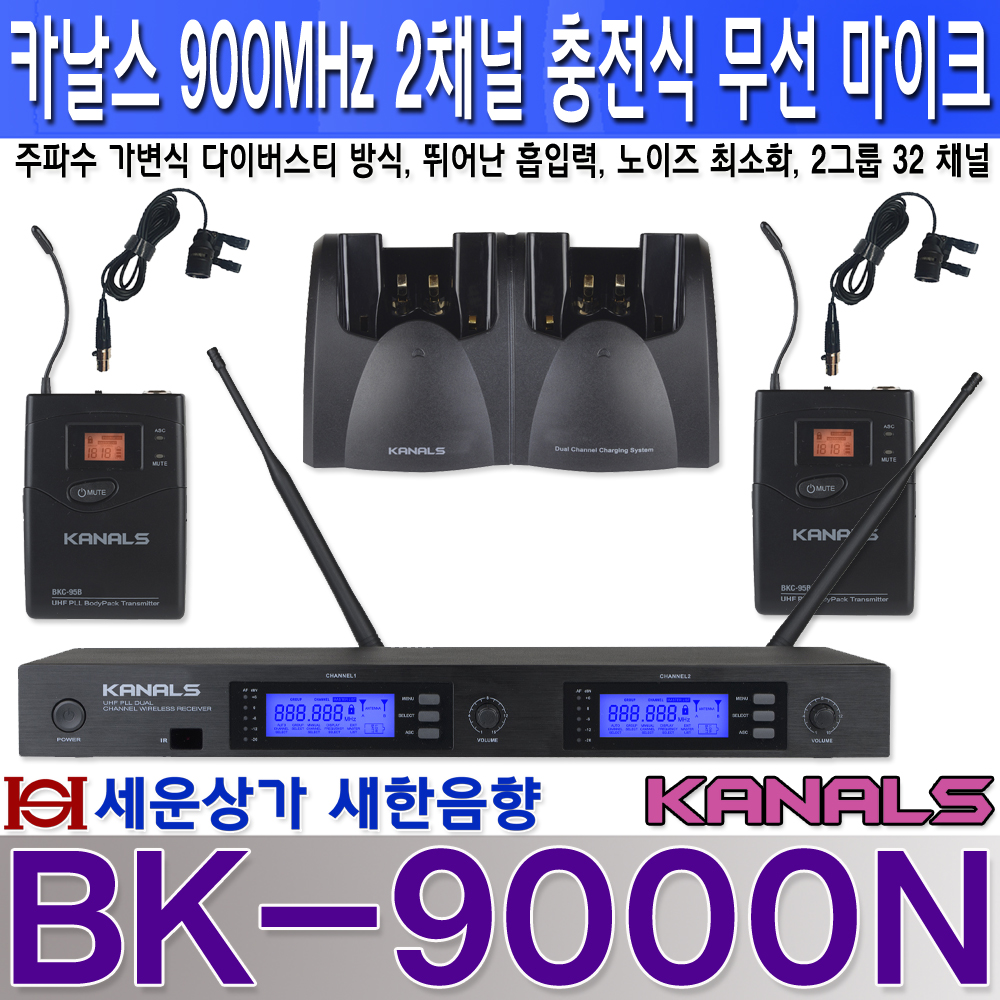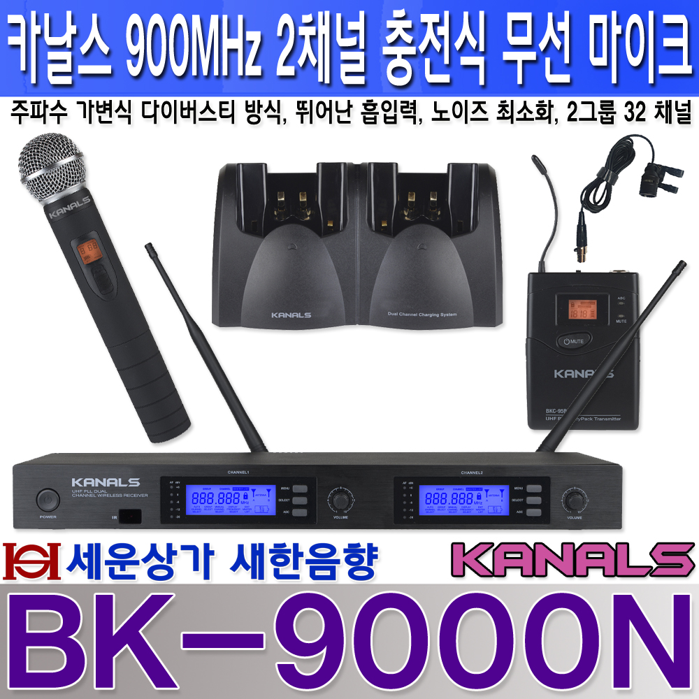 BK-9000N 카날스 충전식 무선 마이크 2채널 900MHz 가변형, 건전지 잔량표시 : 새한음향 세운상가