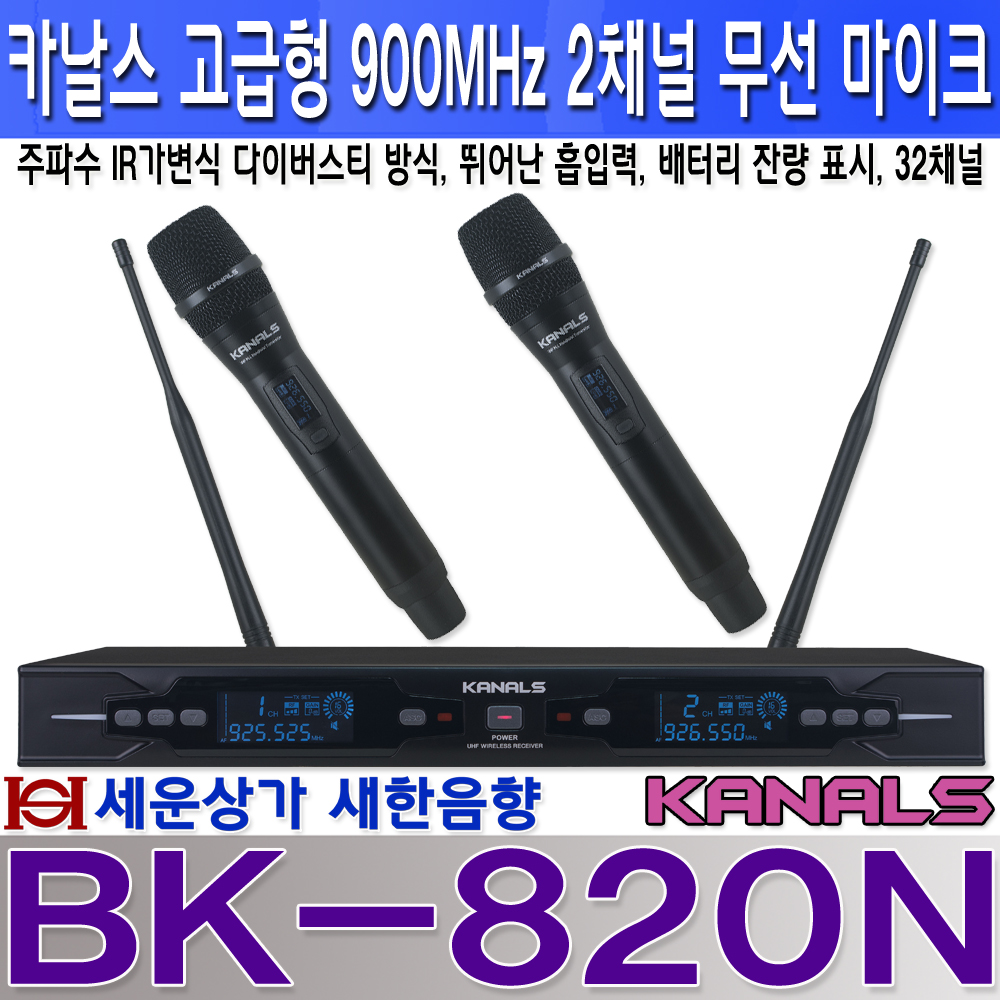 BK-820N 엔터그레인 카날스 고급형 2채널 무선 마이크 900MHz, IR 가변형, 다이버스티 방식, 뛰어난 흡입력, 배터리 잔량 표시 / BK820N