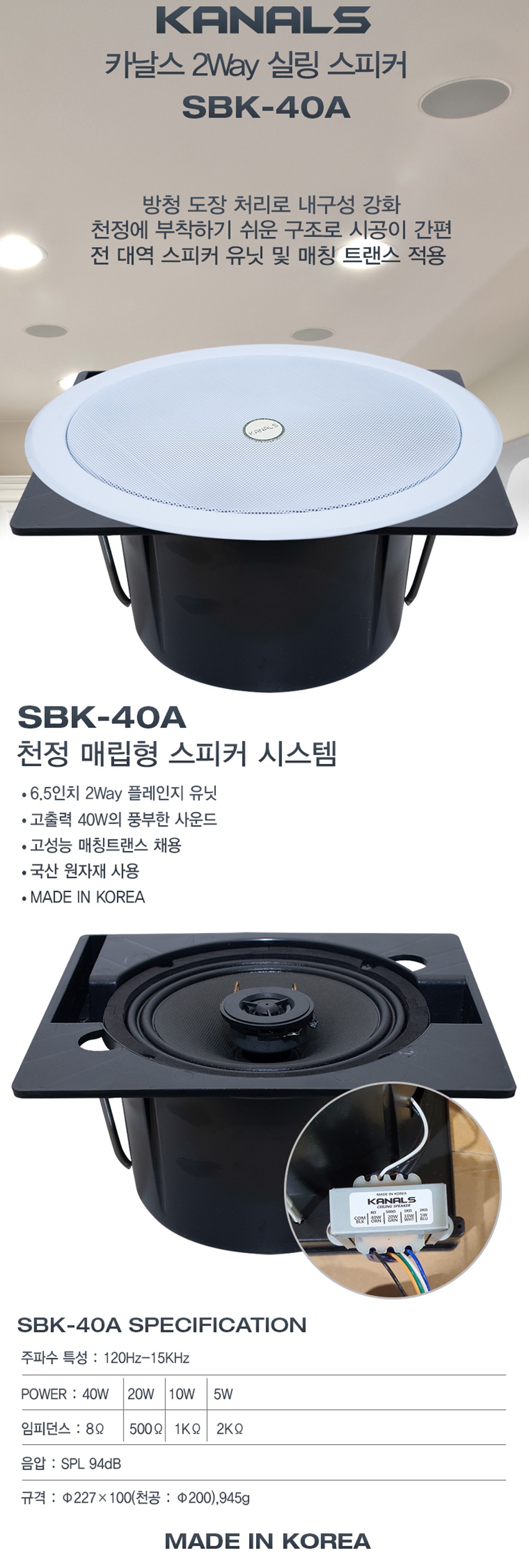 #SBK40A #카날스실링스피커 #실링스피커 #천정스피커 #카페스피커 #매장스피커 #전시장스피커 #팬션스피커 #회의실스피커 #강의용스피커 #백화점스피커 #지하철스피커 #미술관스피커 #레스토랑스피커 #교회스피커 #강당스피커