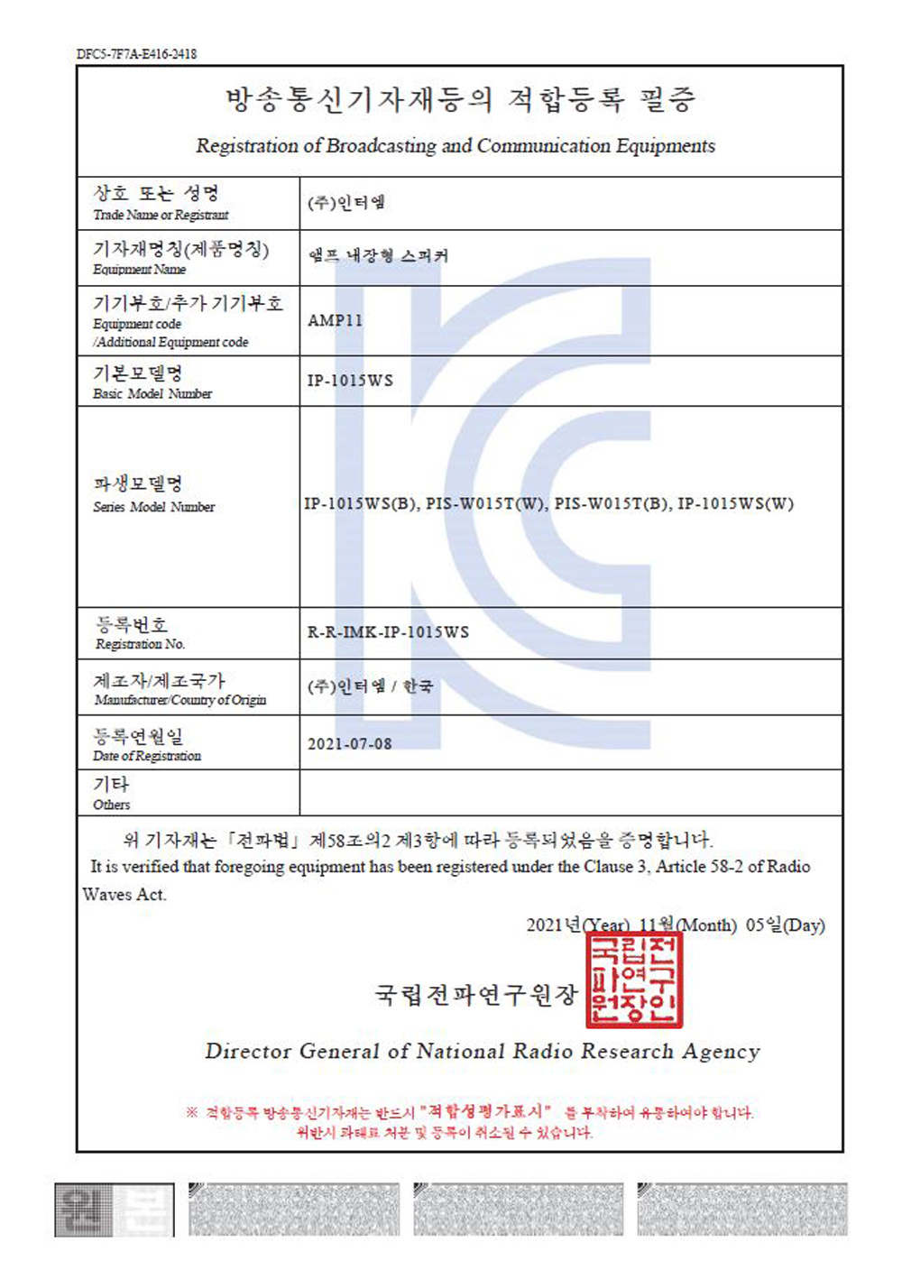 - 방송 통신 기자재 적합 인증 : R-R-IMK-IP-1015WS