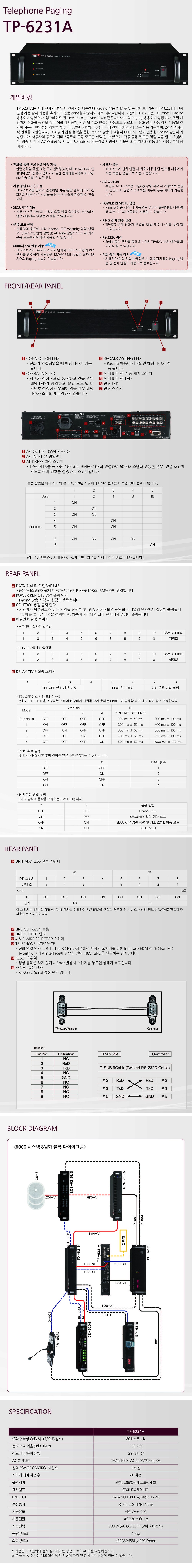 TP-6231A 인터엠 텔레페이징 시스템, 일반 전화선(국선)이나 전화 교환기를 통한 내선과 본 장비를 연결 일반 전화기, 핸드폰, 공중 전화 등을 사용 방송, TP6231A 본문
