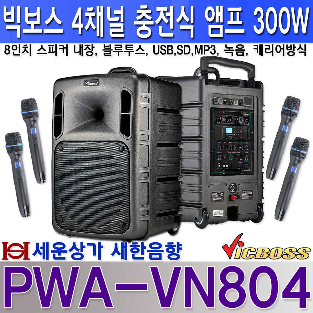 PWA-VN804 빅보스 충전식 앰프 300W, 블루투스, USB, 녹음, 4채널 무선 : 새한음향 세운상가