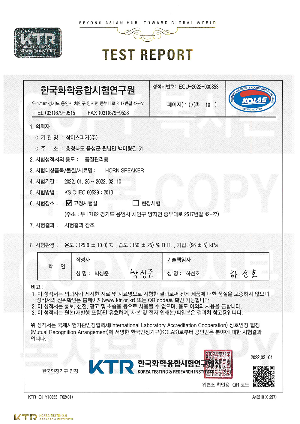 - 한국산업규격 혼 스피커 KSC-6306 결합형 표시 인증 제품 매칭 내장형