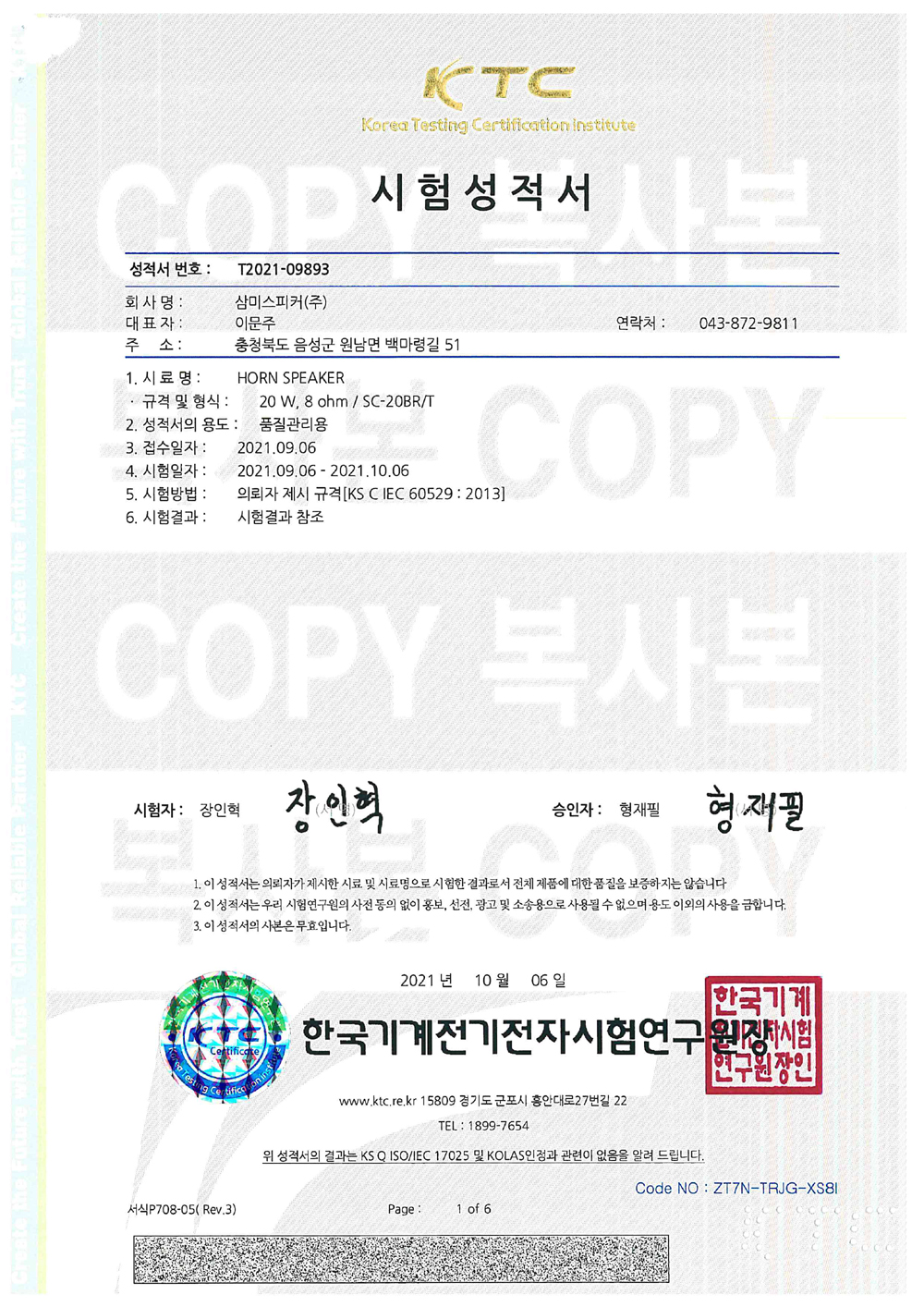- 한국산업규격 혼 스피커 KSC-6306 결합형 표시 인증 제품