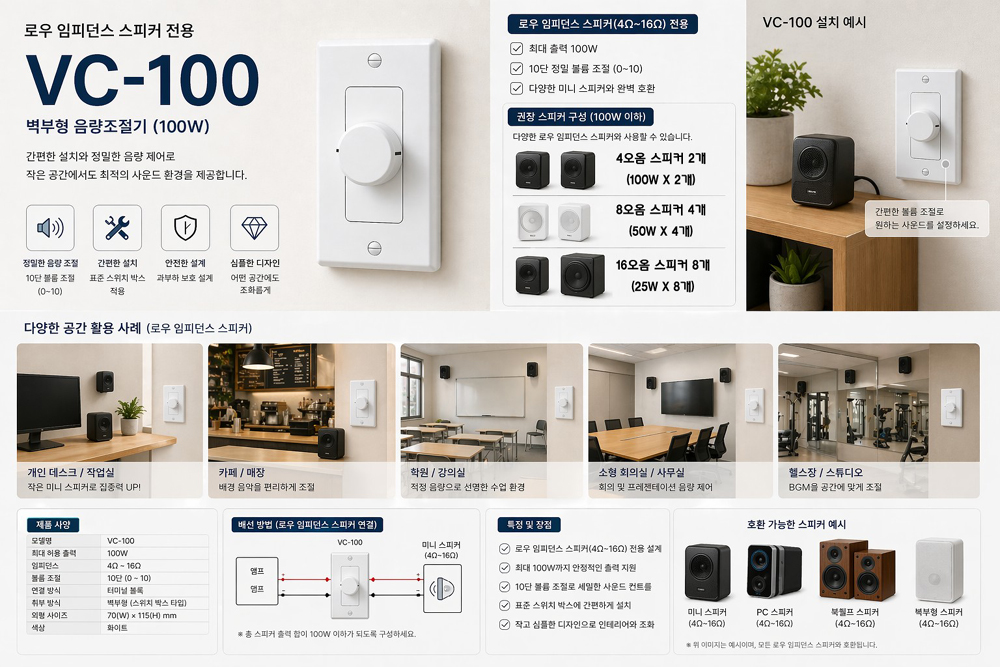 #VC100 #음량조절기 #스피커음량조절기 #ATT #로우스피커음량조절 #8오옴스피커음량조절 #4오옴스피커음량조절 #매장스피커음량조절 #카페스피커음량조절 #모니터스피커음량조절