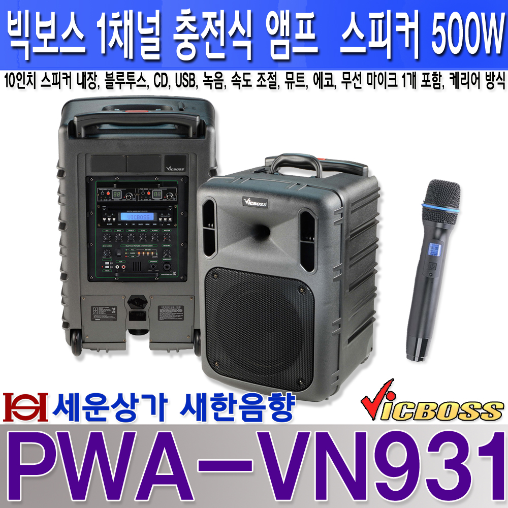 PWA-VN931 빅보스 충전식 앰프 500W, 블루투스, CD, USB, SD, 녹음, 에코, 1채널 무선 마이크 / PWAVN932