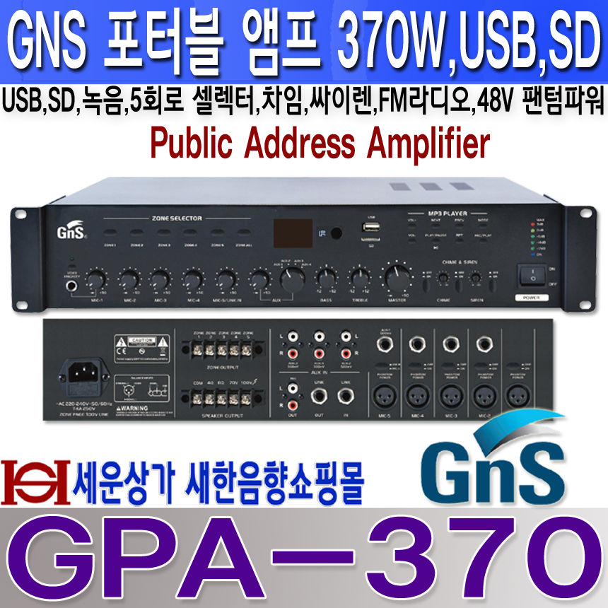 GPA-370, 지엔에스일렉트로닉스앰프 370W,USB,SD,SD,녹음,FM라디오,차임,싸이렌,뮤트,5회로 셀렉터,팬텀파워 GPA370