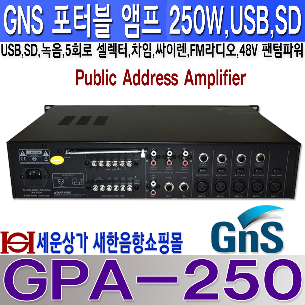 GPA-250, 지앤에스일렉트로닉스앰프 250W,USB,SD,SD,녹음,FM라디오,차임,싸이렌,뮤트,5회로 셀렉터,팬텀파워 GPA250