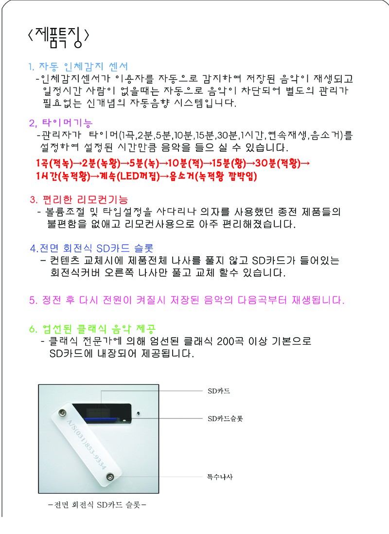 고전 클래식 200여곡 음원 내장, 내장 SD카드 MP3 파일 손쉬운 음원 교체 가능