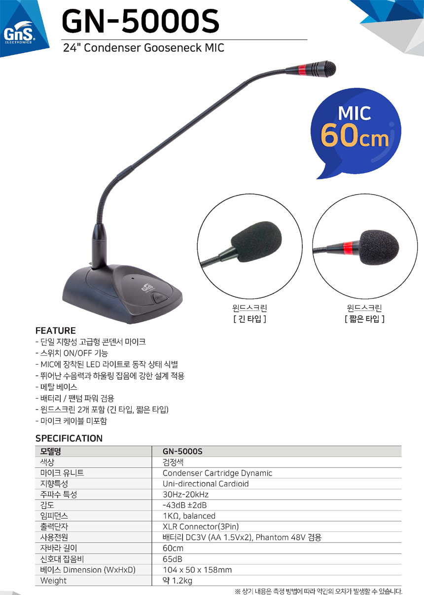 GN-5000S 고감도 구즈넥마이크 60cm 자바라, 하울링 강한 설계, 건전지 팬텀파워 겸용, GN5000S