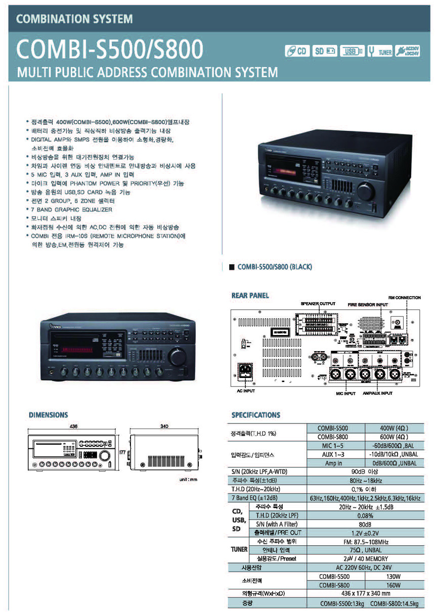 COMBI-S800,소비코프로페셔널(SOVICO)신제품,소방 화재수신반 연동,비상 싸이렌/음성내장,CD,USB,SD카드단자,라디오기능,MP3 파일 재생,USB 녹음, 600W