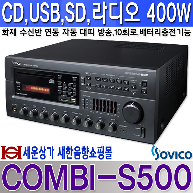 COMBI-S500,소비코(SOVICO) 신제품,소방 화재수신반 연동,비상 음성 & 싸이렌 방송/직상,직상 직하방송/음성내장,CD,USB,SD카드단자,라디오기능,MP3 파일 재생,USB 녹음기능, 400W