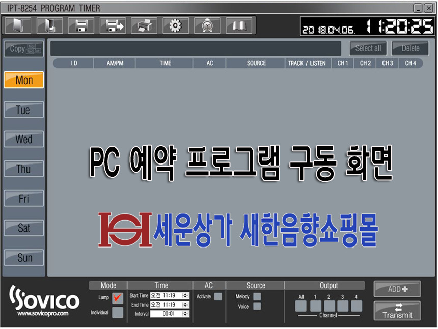 IPT-8254A, 소비코(SOVICO) 주간차임벨타이머 신제품,메모리 내장 음원 추가/변경 가능.정전 보상기능,PC 프로그램 예약 인터페이스, 15개 멜로디 내장,요일별 예약기능, 예약 백업기능,IPT8254A 시보기