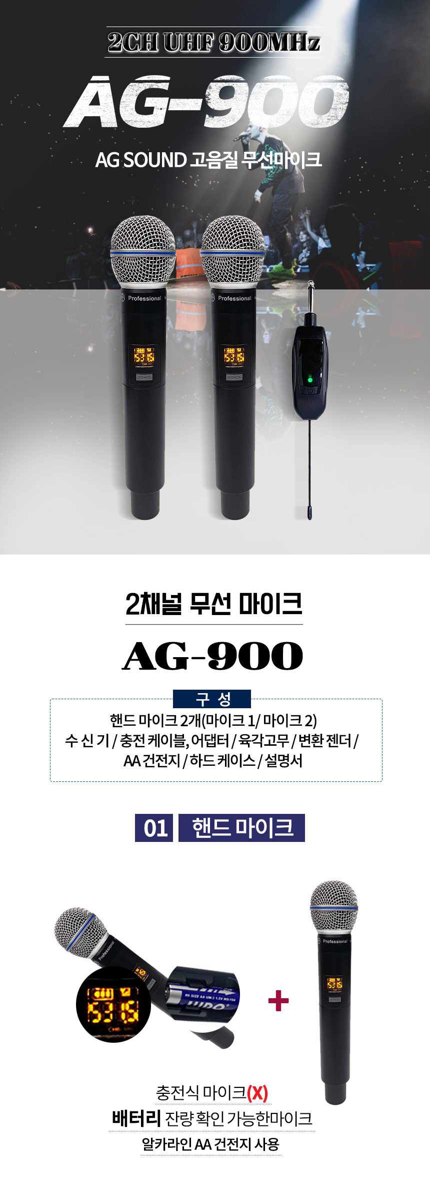 AG-900 2채널 무선마이크, 핸드마이크 2개,휴대용 수신기포함,버스킹,노래방,강의등. AG900