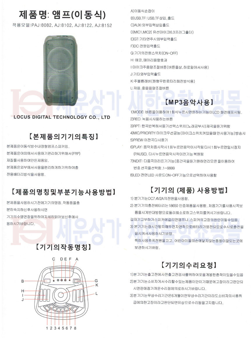 * 제품의 특징 및 사양 ( 충전식 앰프 PAJ-8082 )