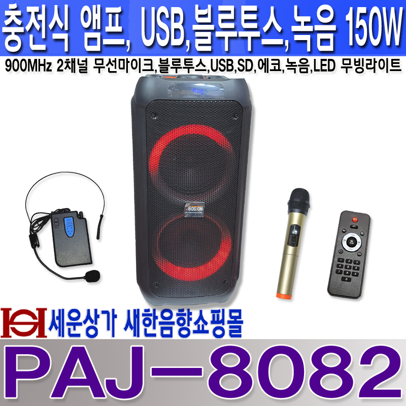 PAJ-8082 충전식앰프 150W, 블루투스,USB, TF 카드,라디오,무빙라이트,2채널 무선마이크, PAJ8082