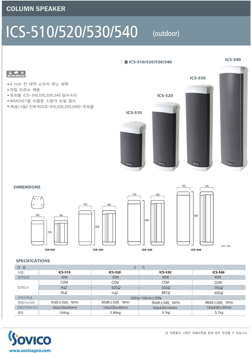 ICS-510, 소비코(SOVICO) 10W 옥외 방수 칼럼스피커,4" 전대역 스피커,매칭 트랜스 채용, 브라켓 이용 지향각 조절 용이. ICS510