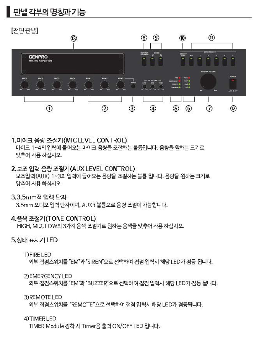 - BGM, 리모트, 타이머, 화재 우선순위 방송 가능