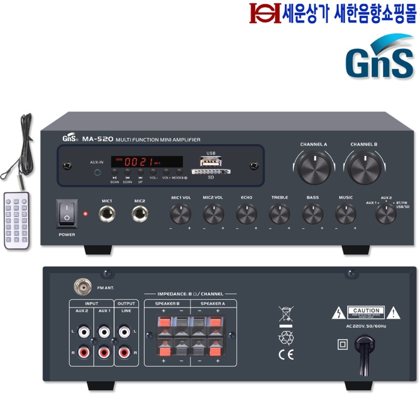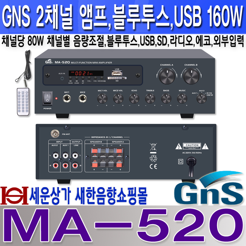 MA-520 GNS 2채널앰프 160W,블루투스,USB,SD,라디오,채널별 음량 조절, 카페, 매장, 강의실, 안전교육장등 다용도 미니앰프 MA520