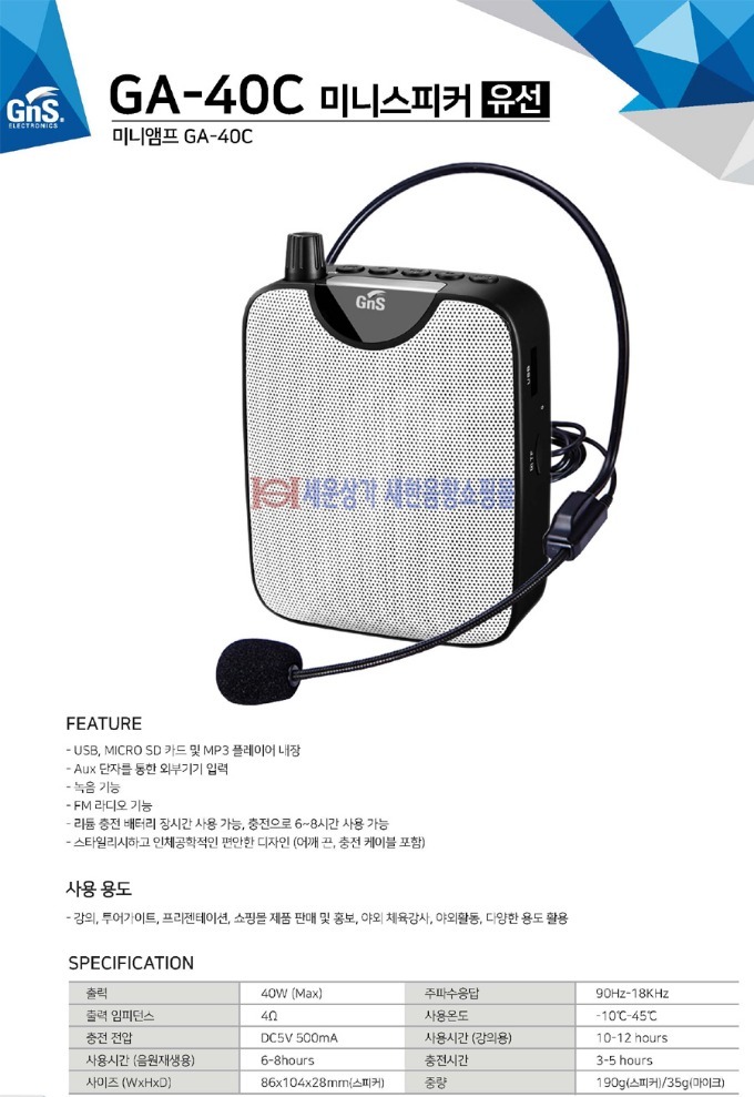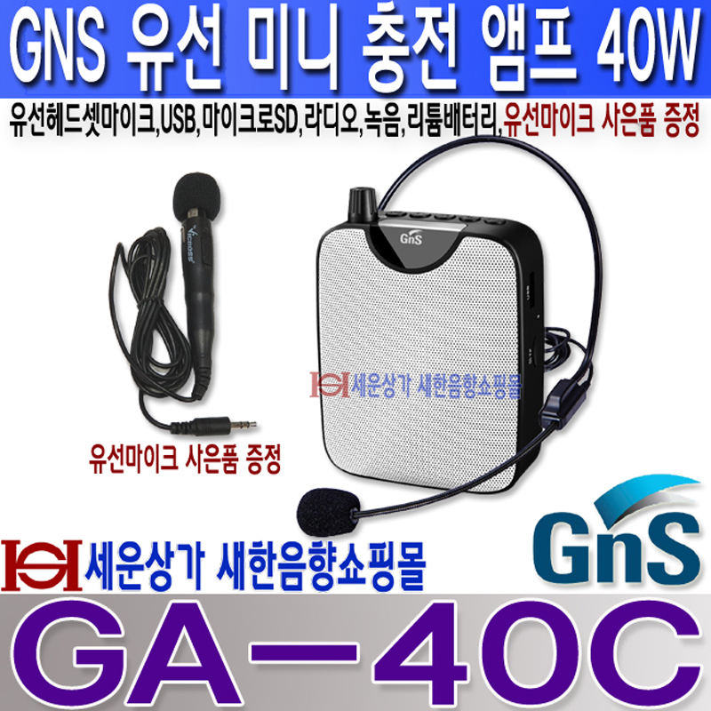 GA-40C 지앤에스(GNS) 미니 충전식앰프 최대40W,유선헤드셋 마이크,USB,TF카드,녹음,라디오,리튬배터리내장,강의,행사,가이드,제품홍보등,GA40C