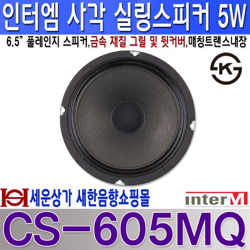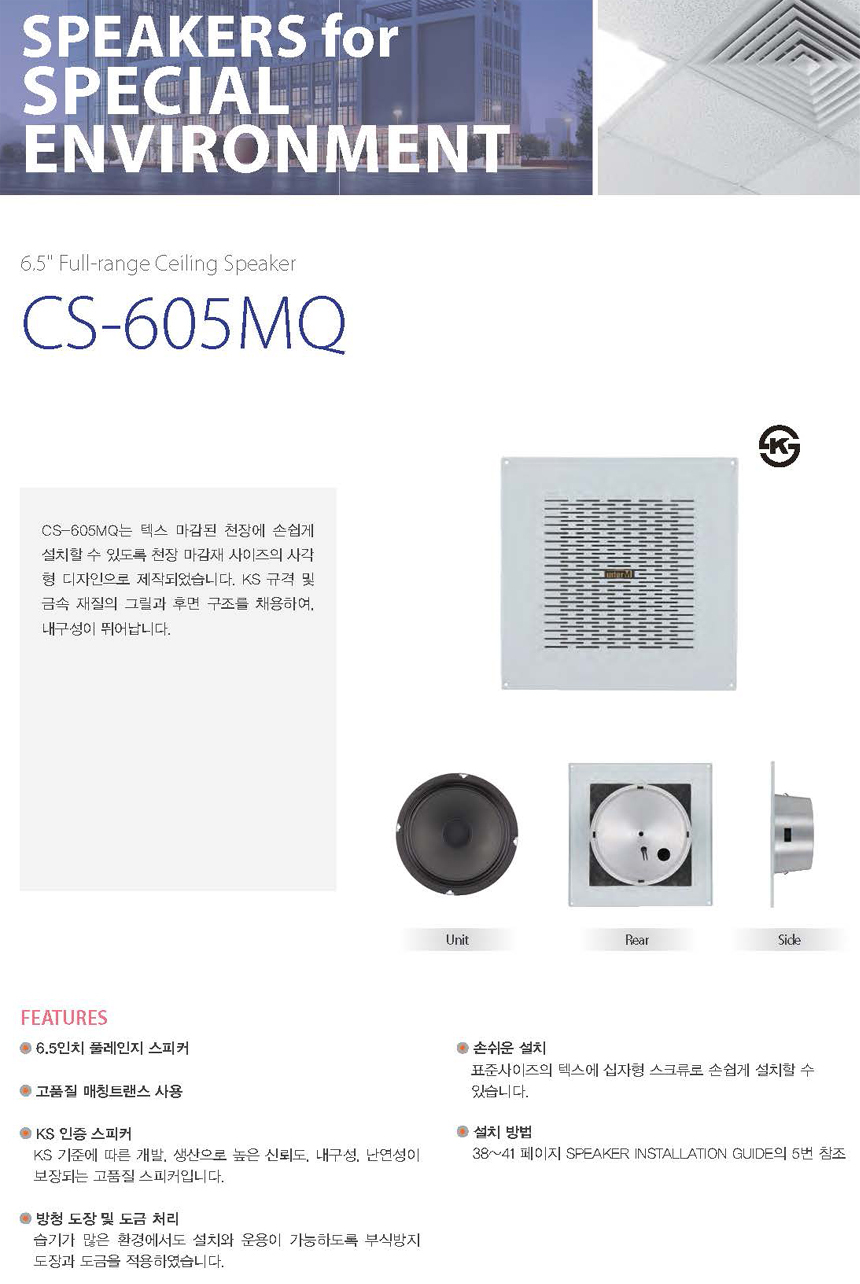 - KS 인증 스피커(CS-605MQ 인증 획득), KS 기준에 따른 개발, 생산으로 높은 신뢰도, 내구성, 난연성이 보장되는 고품질 스피커 입니다.
