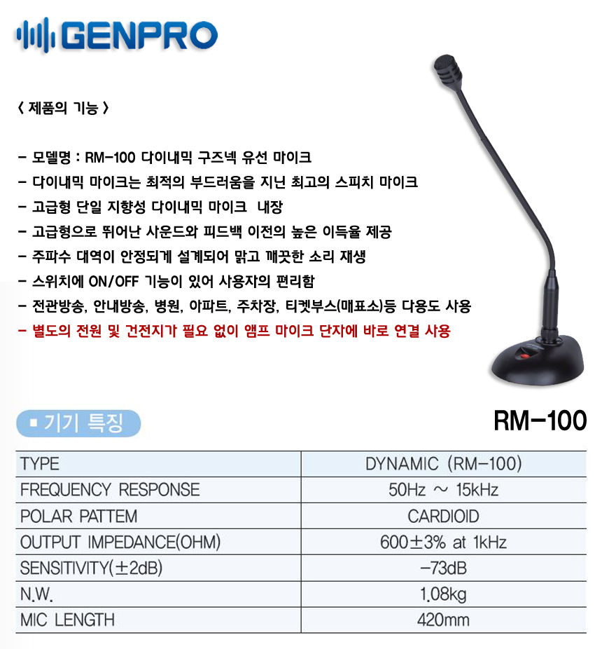 RM-100 젠프로(GENPRO) 다이내믹 유선마이크, 다이내믹 구즈넥 마이크, 전원 및 건전지 필요없이 앰프에 바로 연결해 사용.RM100