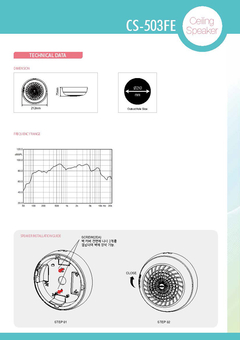 - CS-503FE는 분리형 그릴 채용으로 타공 불가한 천장이나 벽면에도 손쉬운 시공이 가능한 노출형 실링 스피커입니다.