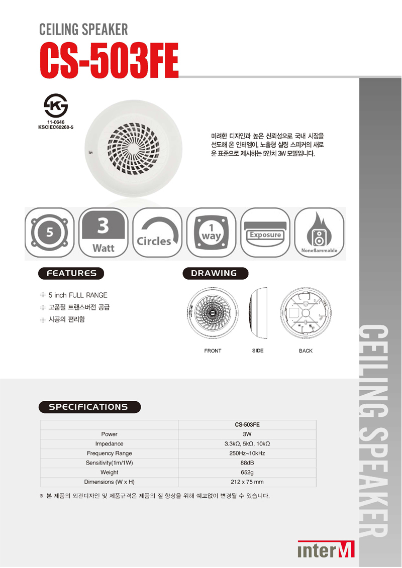 * 제품의 특징 및 사양 ( 인터엠 노출실링스피커 CS-503FE )