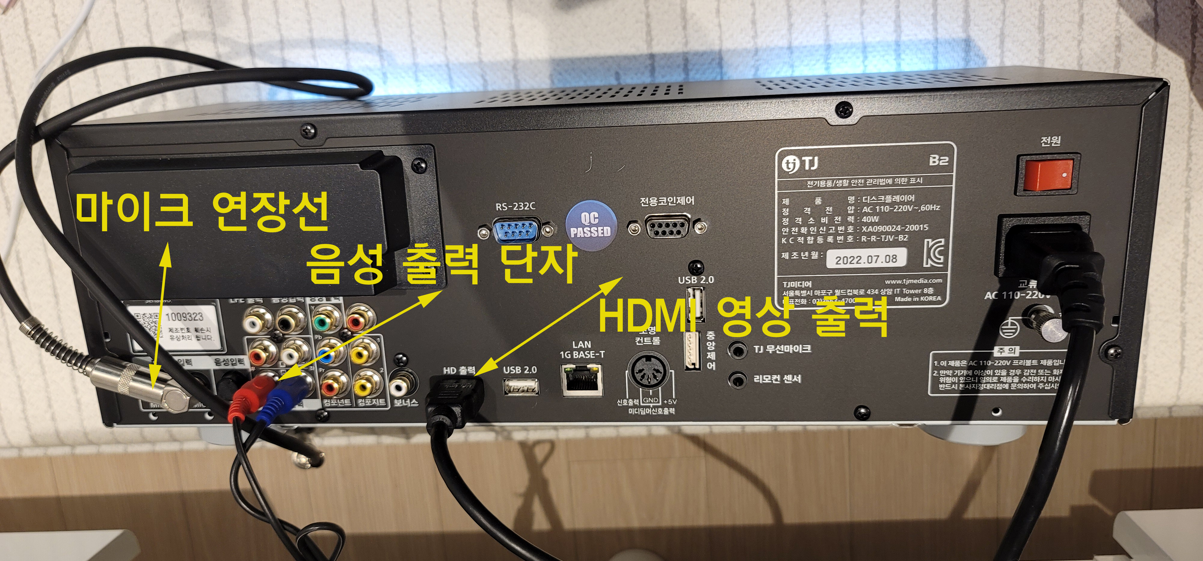 노래방기기에 마이크 입력 단자가 뒷면에 있어, 마이크 연장선 제작하여 전면에 배치하였습니다.