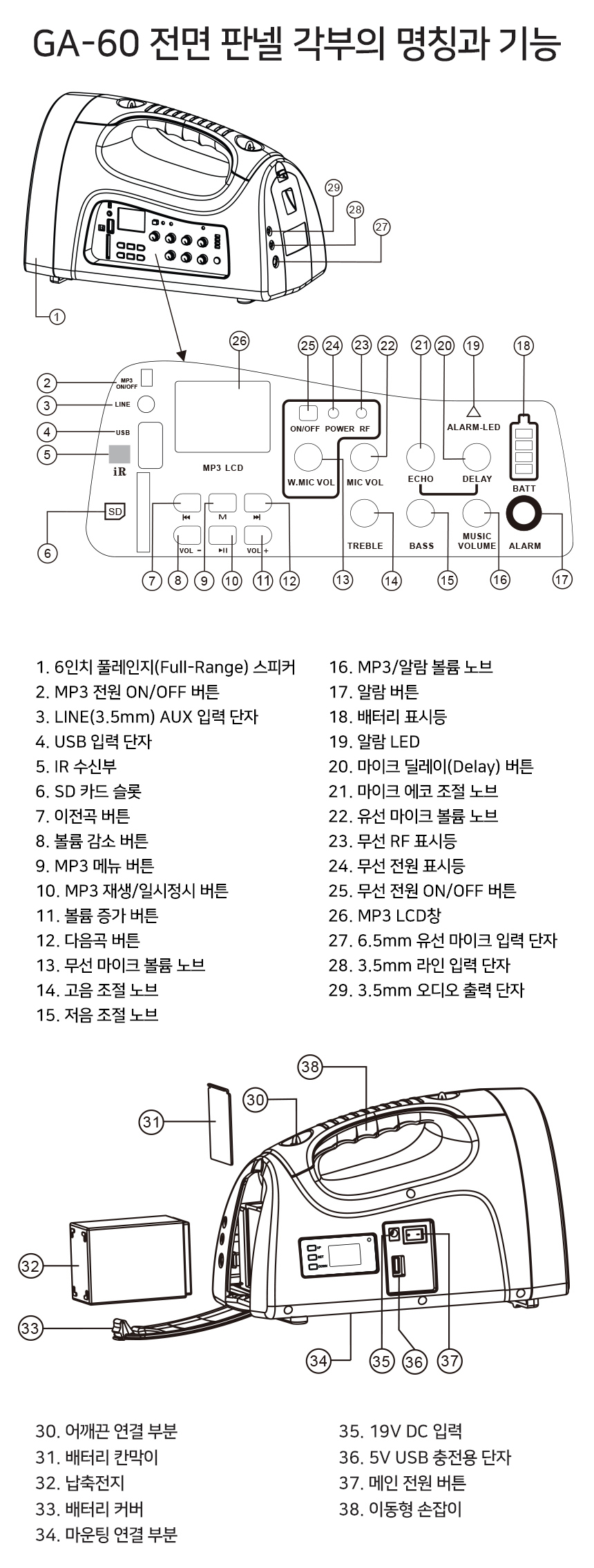 - 유선 마이크 및 MP3 재생을 위해서 6.5mm/3.5mm의 외부입력(AUX) 단자가 제공되며, 전용 충전기 및 충전 배터리내장.