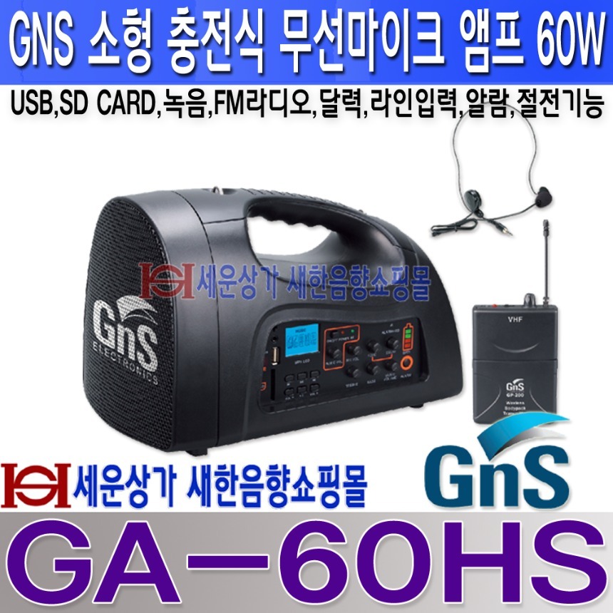 GA-60HS, 지앤에스일렉트로닉스(GNS) 충전식,무선마이크내장 휴대용 소형 앰프,USB,SD,녹음,알람,달력,절전 기능내장,FM 라디오기능