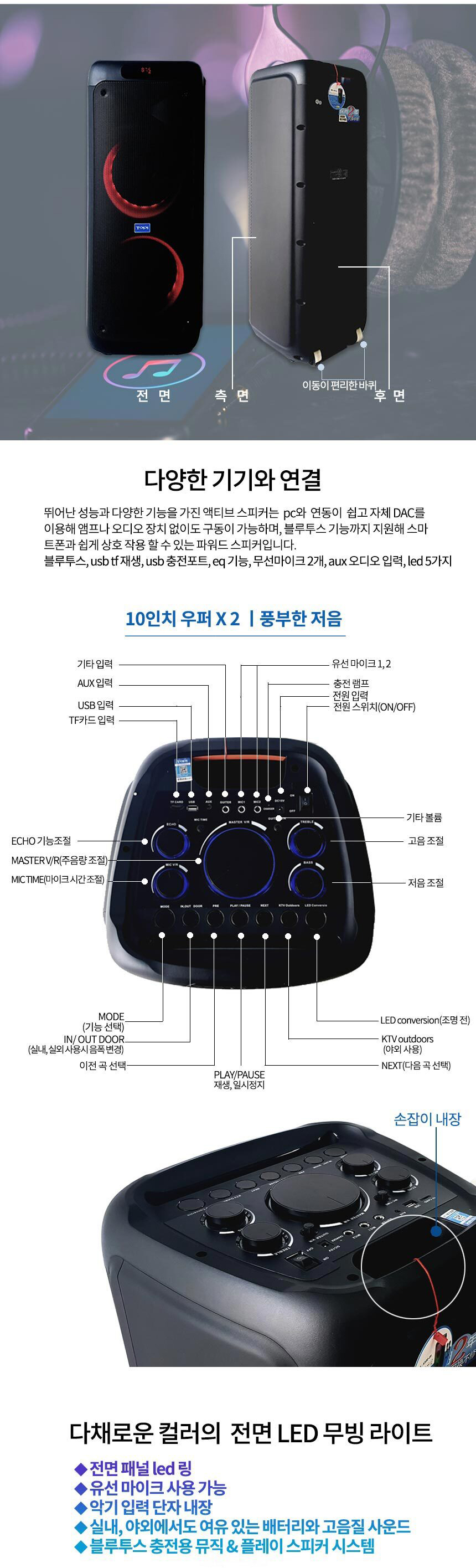 USB, 블루투스, TF CARD, 악기 입력, 외부입력 기능