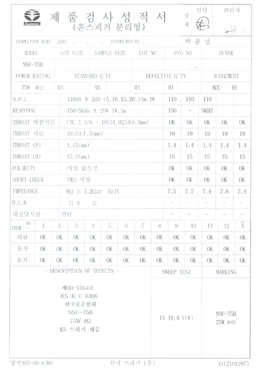 * 상기 검사 성적서는 8오옴 성적서입니다. 16오옴 사양과 저항값만 다르고 동일합니다.*