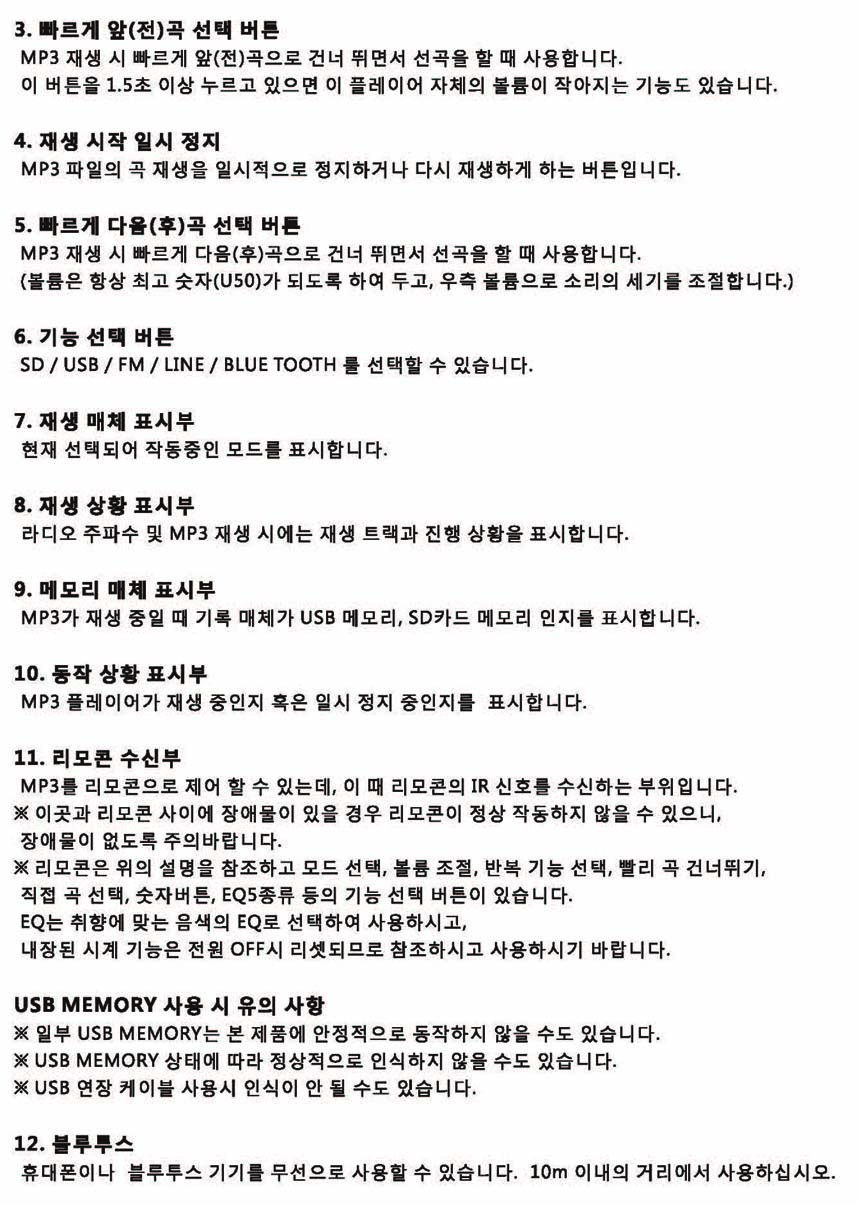 - SD CARD / USB / FM 라디오 기능을 선택 할 수 있는 복합 앰프