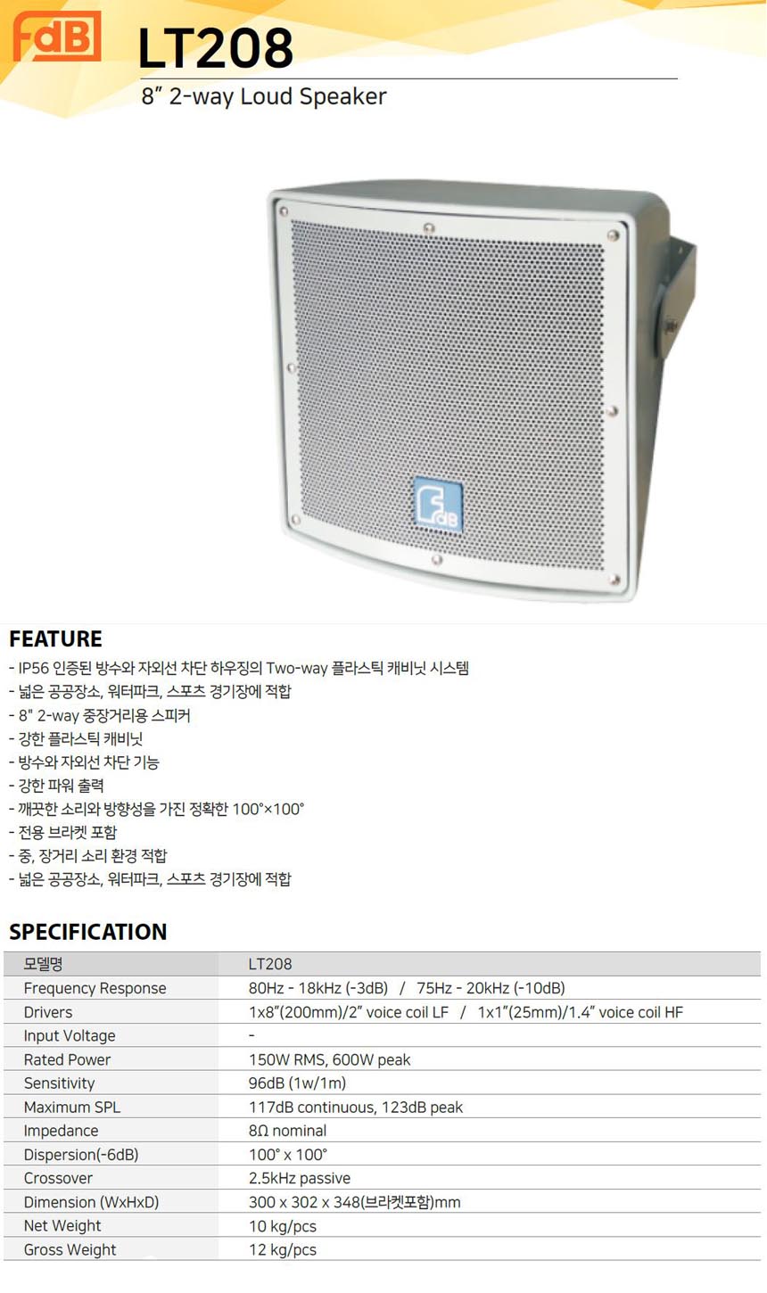 LT208T FDB 8인치 2웨이 방수, 방진 스피커, IP56 등급, 정격 150W, 최대 600W, 넓은 장소 사용 적합, 스포츠 경기장, 워터파크, 놀이공원, 유원지, 체육관등, 하이임피던스 전용.
