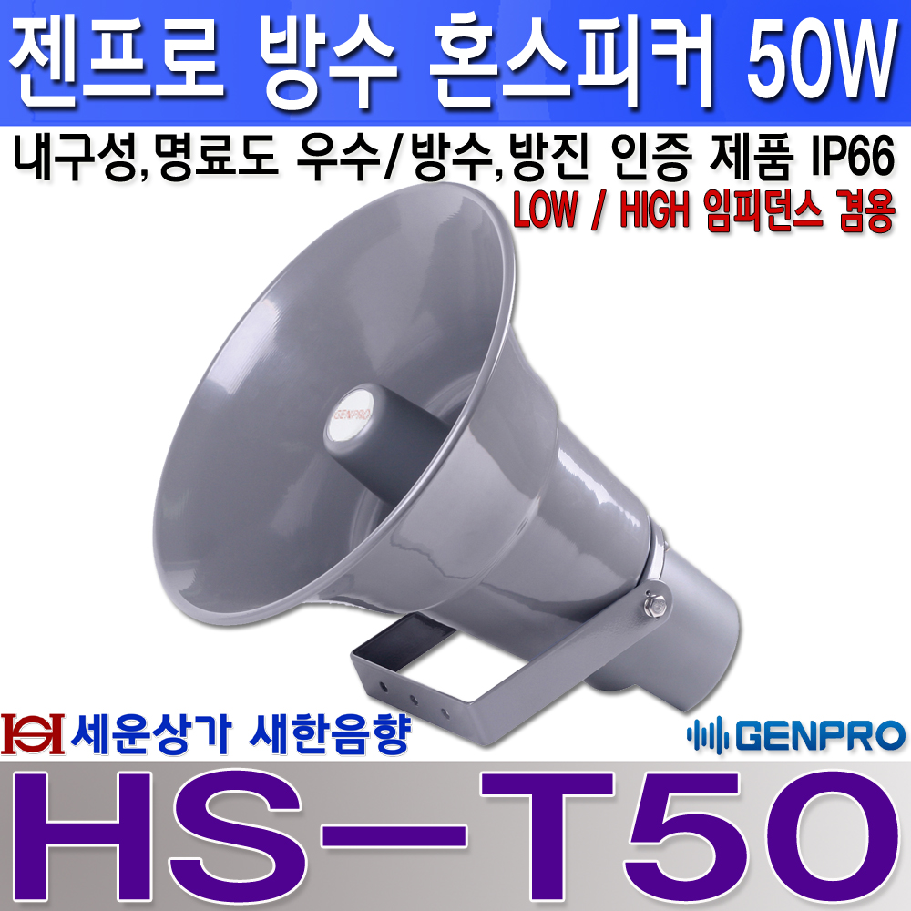 HS-T50 젠프로 방수 혼스피커 50W, 알루미늄 및 아연 다이케스팅 구조물, 방청 도장, 브라켓 포함, IP66 방수 등급 인증.