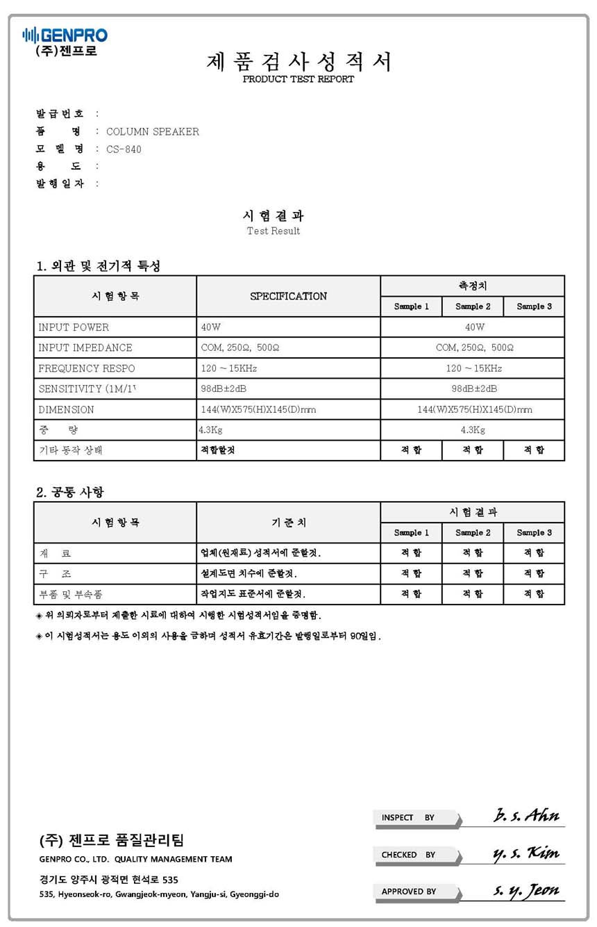 - 품 명 : 40W 방수 컬럼 스피커 / 실내 외 겸용 / CS840
