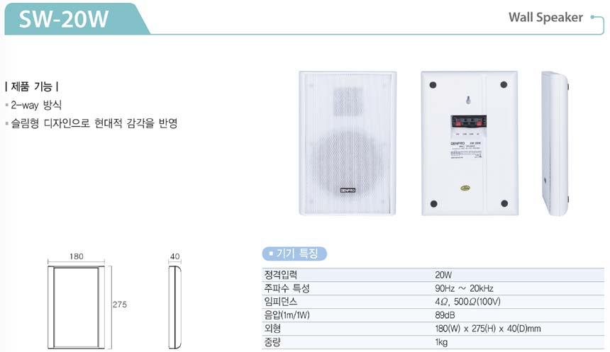 * 제품의 사양 ( SW-20W 젠프로 슬림 벽부형 스피커 )