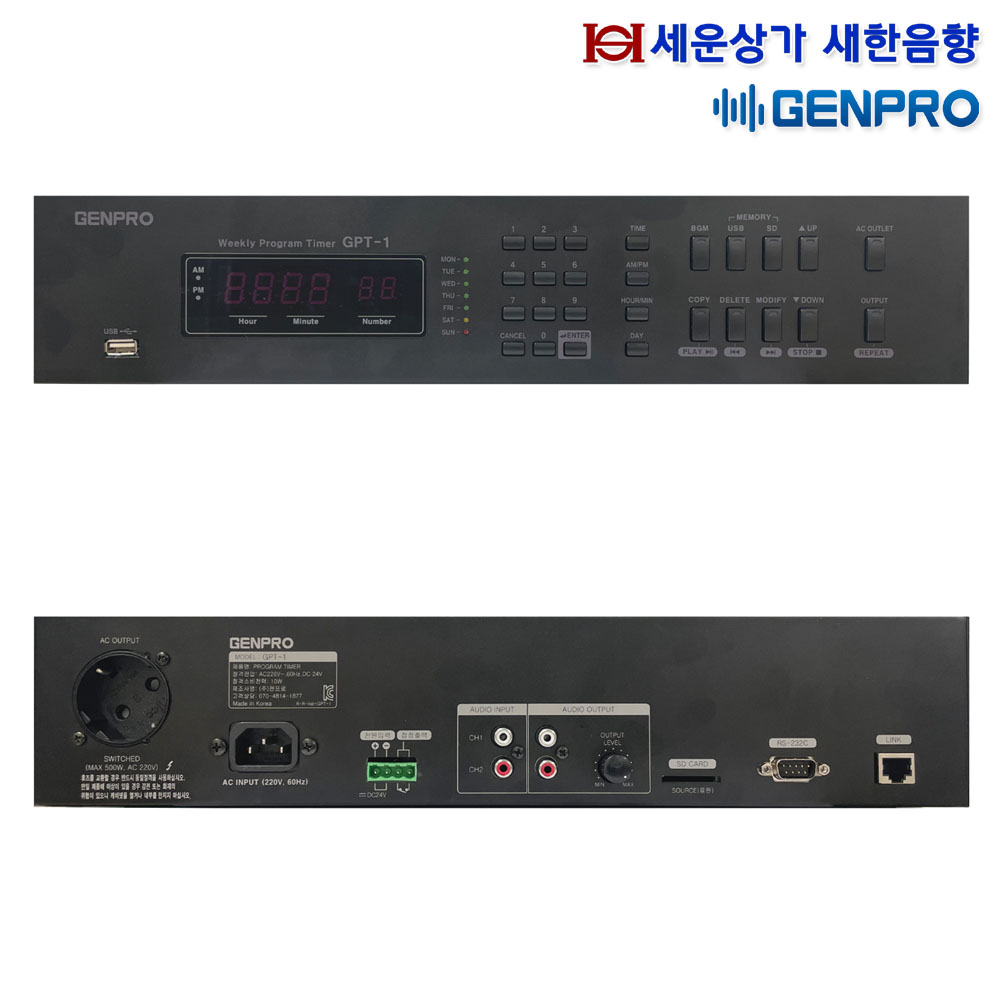 GPT-1 젠프로 주간 차임벨 타이머, 시보기, USB SD 카드 음원 메모리 사용, 음원 변경 가능, RS-232C PC 인터페이스 지원, AC 아웃, 1분 단위 메모리, 요일별 메모리 기능, DC 24V 입력, 접점 출력 기능.GPT1