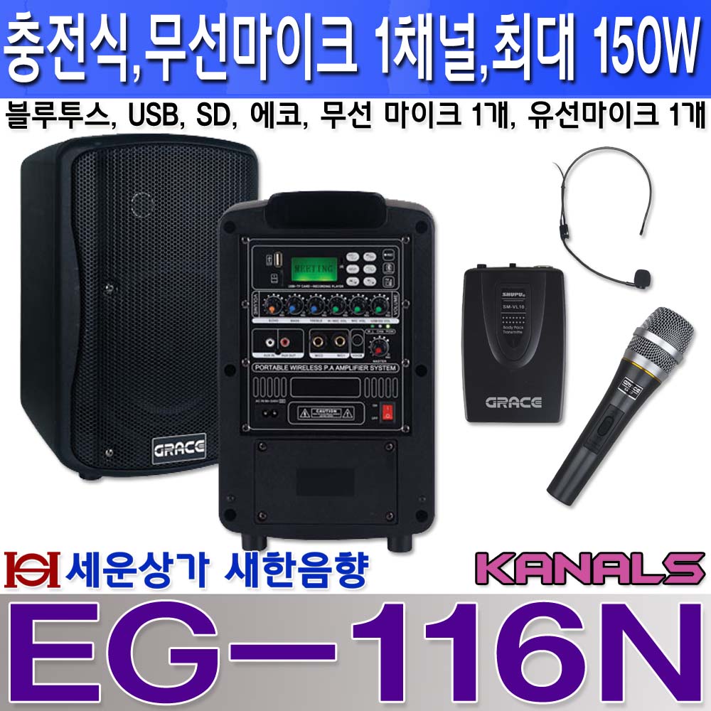 EG-116N 카날스 충전식 엠프 150W, 200MHz 1채널 무선 마이크,유선 마이크, 블루투스, USB, SD, 에코, 녹음 / EG116N