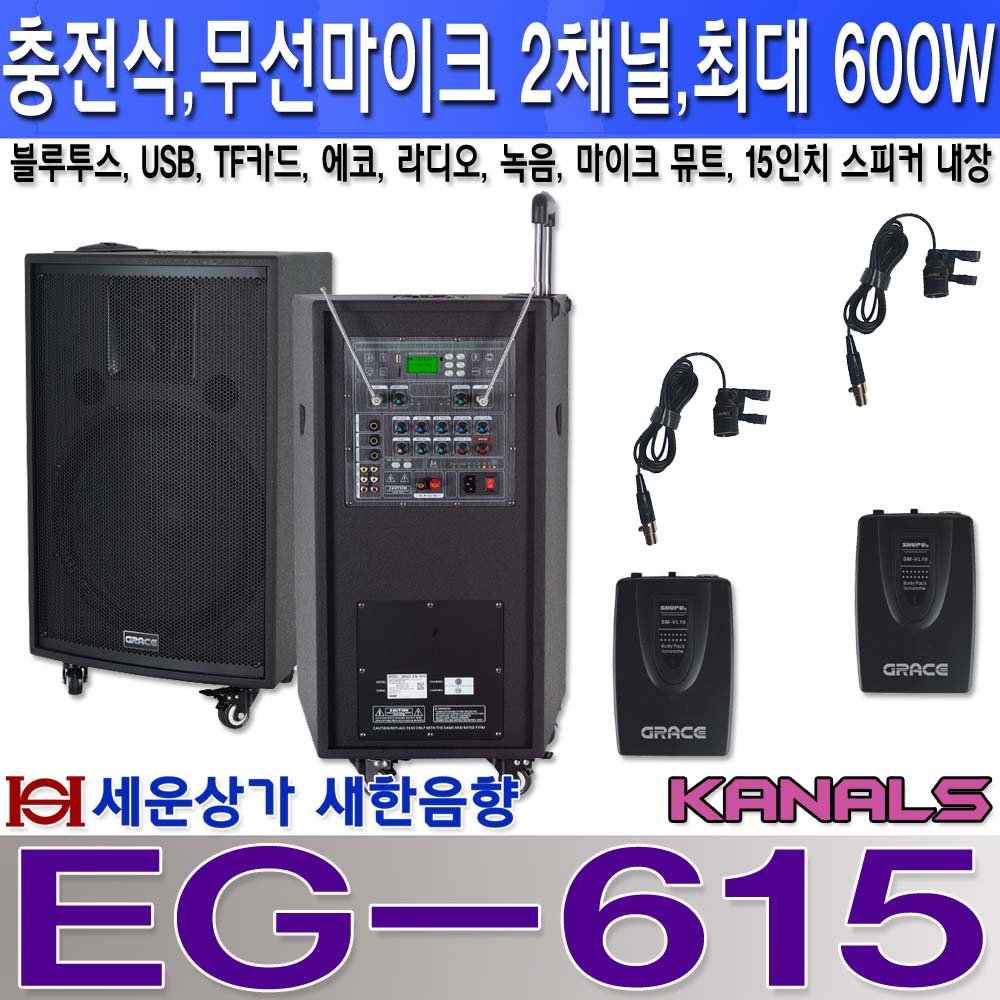 EG-615 카날스 충전식 앰프 600W, 2채널 무선 마이크, 블루투스, USB, TF CARD, 라디오, 에코, 녹음, 뮤트 / EG615 / 버스킹, 안전 교육, 전시장, 실내 외 행사, 강당, 교회, 체육관, 휘트니스, 헬스장 등