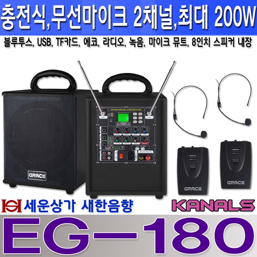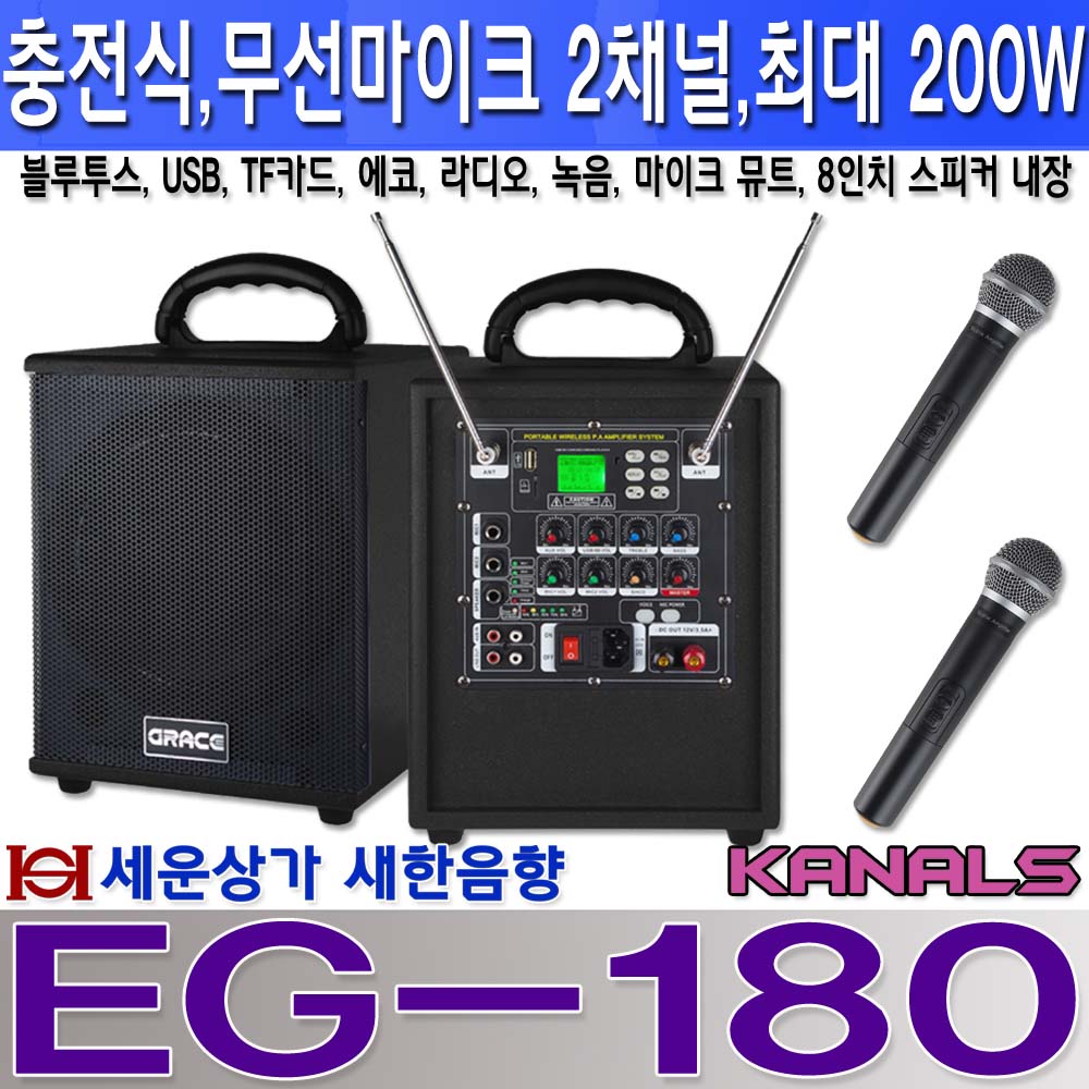 EG-180 카날스 충전식 앰프 200W, 2채널 무선 마이크, 블루투스, USB, TF CARD, 라디오, 에코, 녹음, 뮤트/ EG180 / 버스킹, 안전 교육, 전시장, 실내 외 행사, 강당, 교회, 체육관, 휘트니스, 헬스장 등